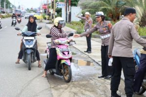 Anggota Polri nampak turun ke jalan dan memberikan takjil baik kepada pengendara sepeda motor maupun mobil yang melintas.