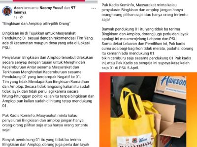 Dan bingkisan tersebut menurut akun itu ditujukan untuk masyarakat pendukung 01, sesuai dengan rekomendasi tim kecamatan, maupun desa yang berada pada lokasi PSU (pemungutan suara ulang).