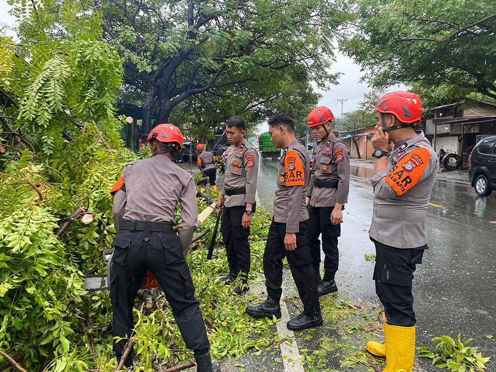 Personel Ditsamapta Polda Sulteng menggunakan peralatan SAR berupa gergaji mesin atau chainsaw, untuk memotong pohon tumbang. Mereka juga bekerja sama dengan warga untuk membersihkan jalan yang terhalang oleh pohon tumbang.