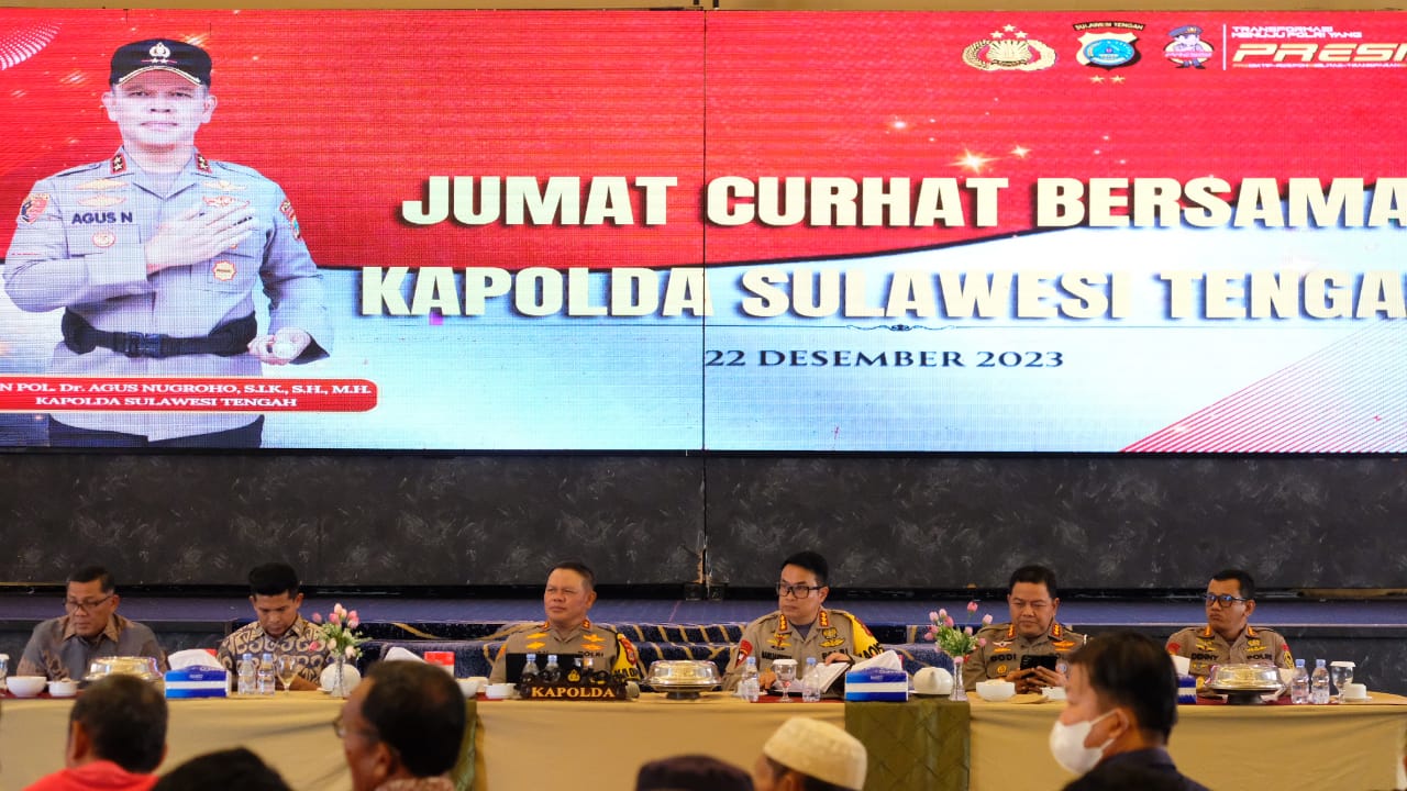 JURNALPOLRISULTENG.ID – PALU, Kapolda Sulawesi Tengah, Irjen Pol Dr. Agus Nugroho, SIK,SH,MH., memimpin kegiatan Jumat Curhat sekaligus mendengar secara langsung keluhan masyarakat kota Palu bertempat di Swiss Bell Hotel, Jumat (22/12/2023).