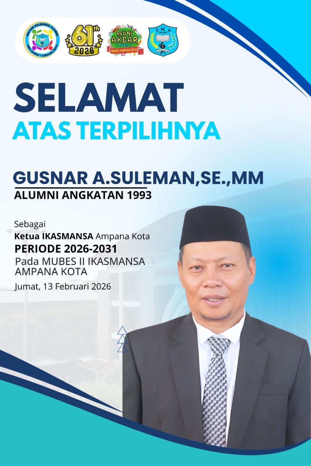 Hasil musyawarah besar IKASMANSA ke II yang dibuka oleh Sekretaris Daerah Tojo Una Una,  Gusnar Sulaeman, SE, MM terpilih sebagai ketua Priode 2026 -2031. Jumat 13 Februari 2026.